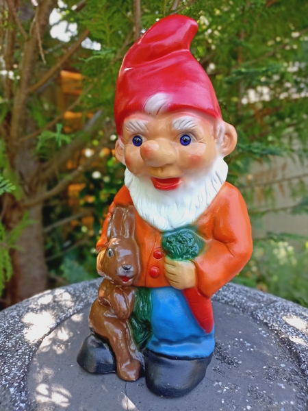 Der Gartenzwerg mit einem Hasen ist eine herzige Deko für den Garten.