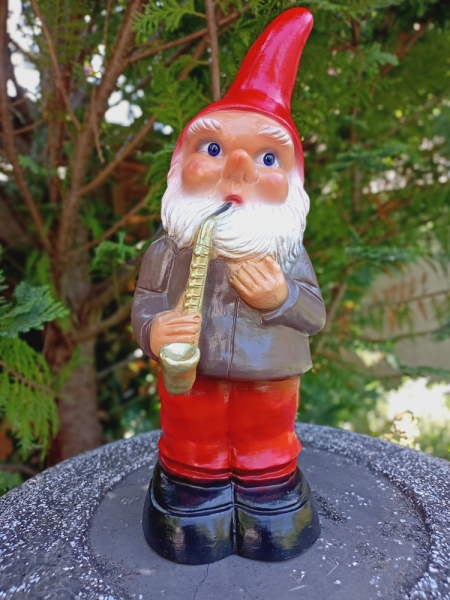 Ein Musiker- Gartenzwerg mit Saxophon für den Jazz-Fan als Deko im Garten, auf dem Balkon oder auf der Terrasse.