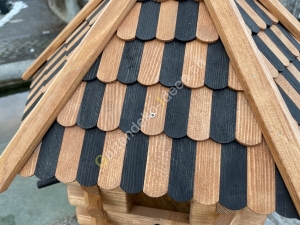 Das Holz Vogelhaus ist teakfarben, das Dach ist zweifarbig mit Holzschindeln in Teak und Palisander gedeckt.