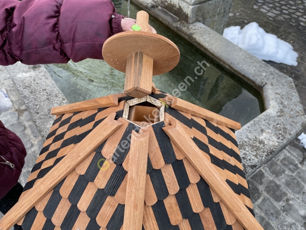- Der Boden der XXL Vogelfutterstation aus Holz und die Dachplatten, an welchen die Dachschindeln angeklebt sind, sind wasserabweisend.