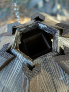 - Unter jeder Öffnung sind Holzstäbe angebracht, an die man Meisenknödel oder Meisenringe aufhängen kann.
