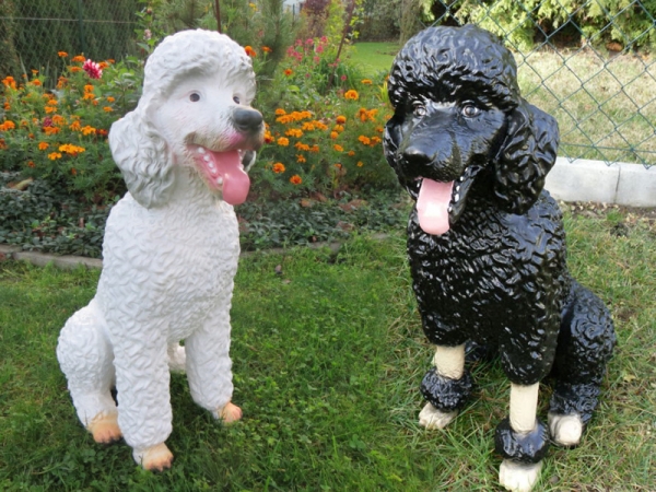 Wir bieten diese Gartendekofigur in zwei Farbvarianten an: Als schwarzen Pudel und als weissen Pudel.