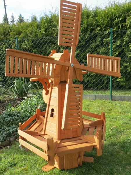 Die hollände Windmühle aus Holz für den Garten ist in fünf Teile auseinandernehmbar ( Sockel, Balkon, Turm, Kopf, Windrad ).