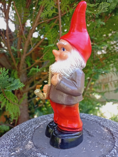 Ein Musiker- Gartenzwerg mit Saxophon für den Jazz-Fan als Deko im Garten, auf dem Balkon oder auf der Terrasse.