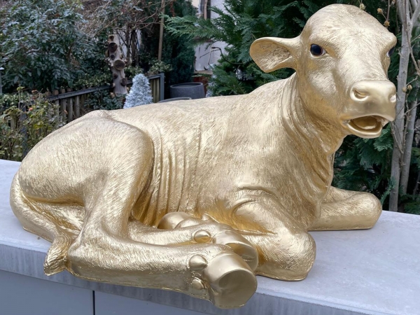 Goldenes Dekokalb lebensgross, liegend, als Gartenfigur